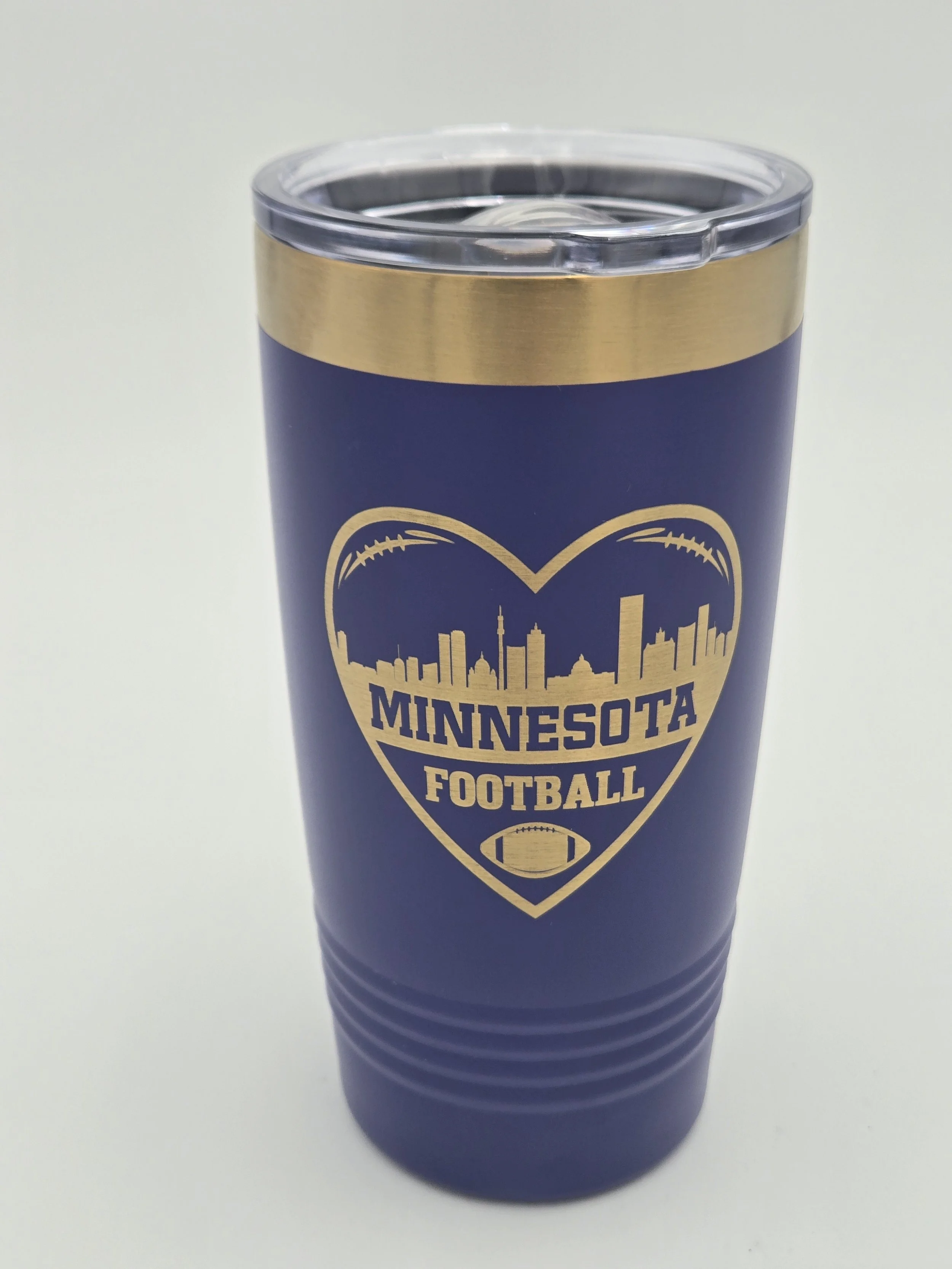 The rich purple powder-coated exterior paired with the striking gold engraving gives this tumbler a premium, eye-catching look that stands out in any setting. The heart-shaped football graphic with a skyline silhouette adds a unique, local-inspired touch perfect for Minnesota fans.